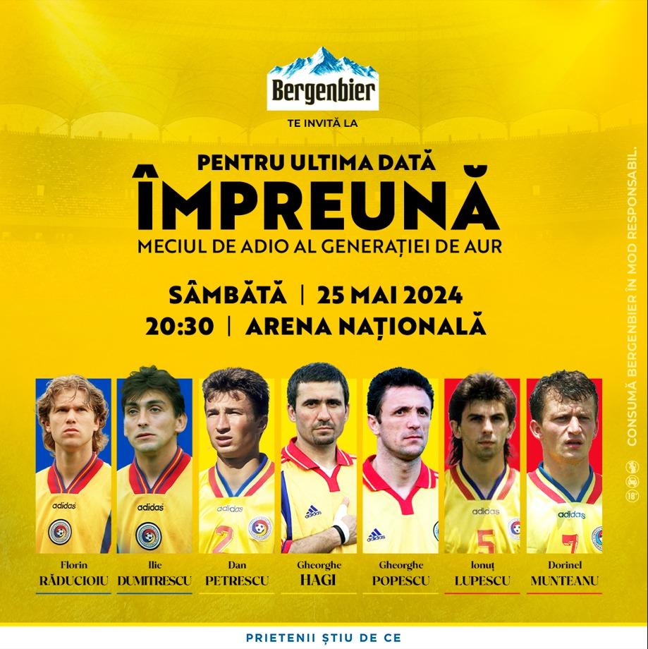Bergenbier, unul dintre cei mai longevivi parteneri ai Echipei Naționale, se alătură Generației de Aur la meciului de retragere. Pe 25 mai 2024, pe Arena Națională, într-o demonstrație de recunoaștere a contribuției lor, tricolorii vor scrie o pagină memorabilă în istoria fotbalului românesc, alături de fanii pe care i-au bucurat de atâtea ori.
