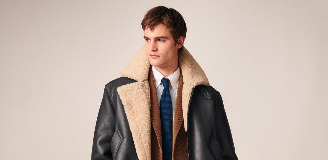 Look 4: O jachetă aviator din piele de oaie conferă un plus de modernitate ținutelor relaxate, purtată peste un costum călduros de culoare camel, cu o cămașă albă Oxford și o cravată din mătase jacquard bleumarin.  Combinația dintre textura tradițională și stilul elegant, potrivit pentru mediul urban, surprinde abordarea newyorkeză a colecției în ceea ce privește rafinamentul ținutelor casual.