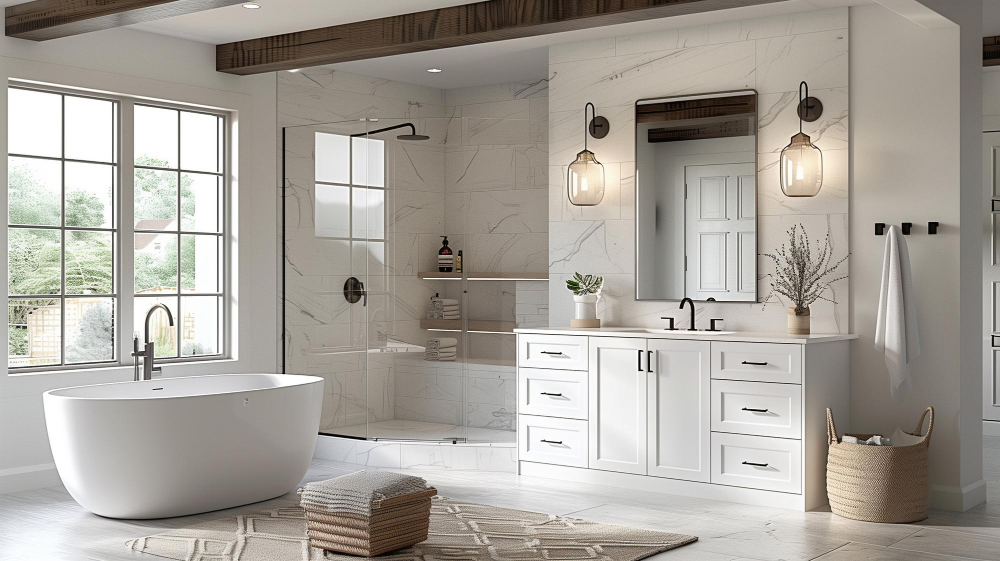 Dacă dorești să adaugi un strop de culoare, integrează accente subtile prin accesorii, prosoape sau decorațiuni. Nuanțele de verde salvie, lavandă sau albastru deschis sunt perfecte pentru a completa paleta de culori liniștitoare și a crea un spațiu armonios.